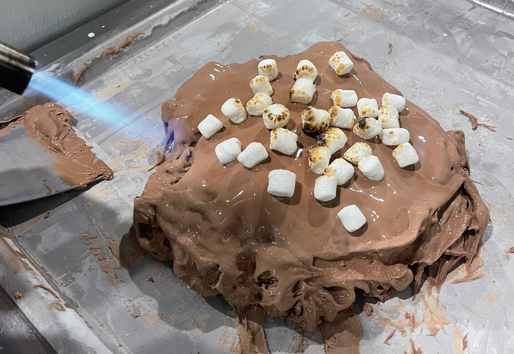 Inspired by one of our sons, we created this hot chocolate ice cream! Our rich chocolate ice cream with slightly toasted marshmallows, super good!
